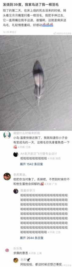 我家鸟送我了一根羽毛。