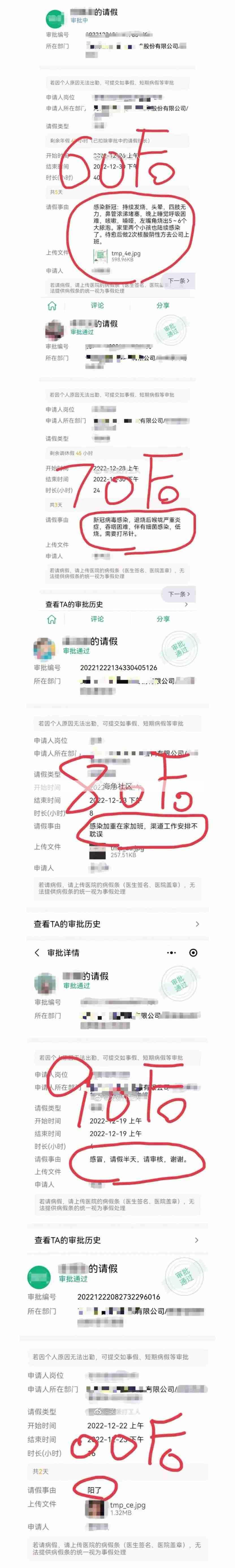 不同年龄同事的请假条。