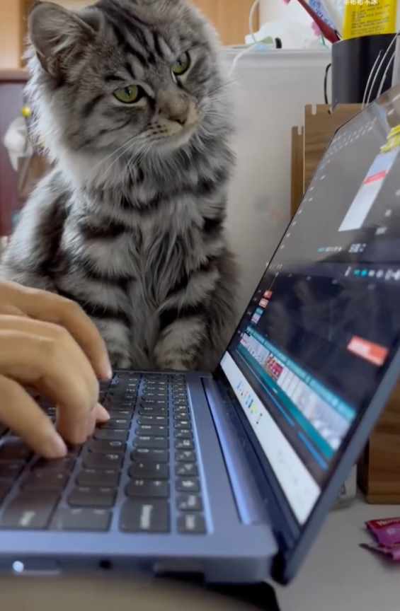 在一旁监督主人工作的猫咪。