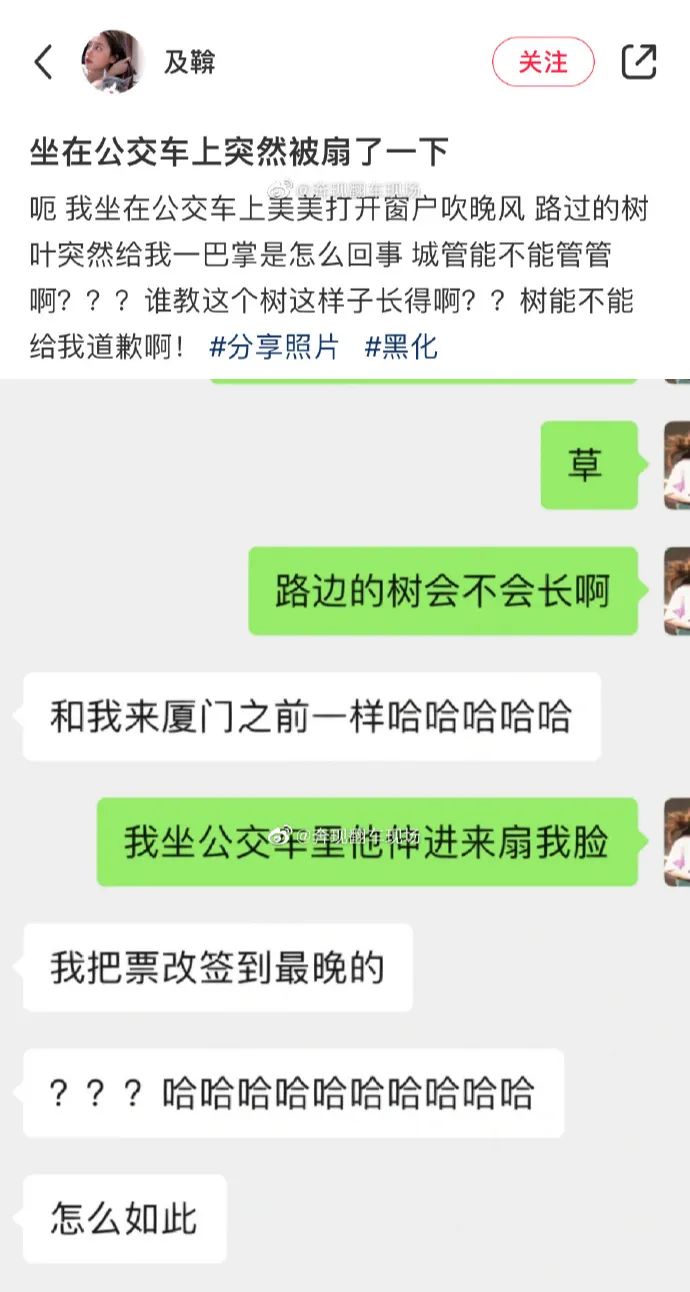 坐在公交车上突然被树扇了一巴掌。